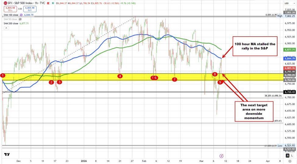 Der S&P bewegte sich von 6831 auf ein Tief von 6786. Der S&P notiert nun bei 6796, was an diesem Tag nahezu unverändert ist. Der in der letzten Stunde erreichte Höchstpreis erreichte seinen Höhepunkt bei 6845,08. Der 100-Stunden-MA liegt bei 6844,76. Ein Höchststand in der Nähe dieses Niveaus hält die Verkäufer technisch gesehen im Spiel. Die Unterstützung liegt derzeit bei 6764 bis 6789 (siehe gelber Bereich im Diagramm unten).