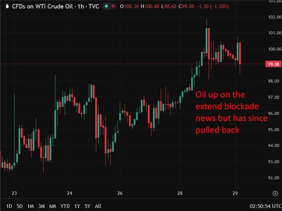 Auslöser war ein Bericht des Wall Street Journal unter Berufung auf US-Beamte, wonach Trump sein Team angewiesen habe, sich auf eine ausgedehnte Blockade iranischer Häfen vorzubereiten, anstatt die Bombardierung wieder aufzunehmen oder Teherans aktuelles diplomatisches Angebot anzunehmen. Die Straße von Hormus, durch die normalerweise etwa 20 % der weltweiten Öl- und LNG-Vorräte fließen, bleibt gesperrt, da der Iran die Handelsschifffahrt blockiert und die USA ihre eigene Blockade des iranischen Hafenzugangs durchsetzen.