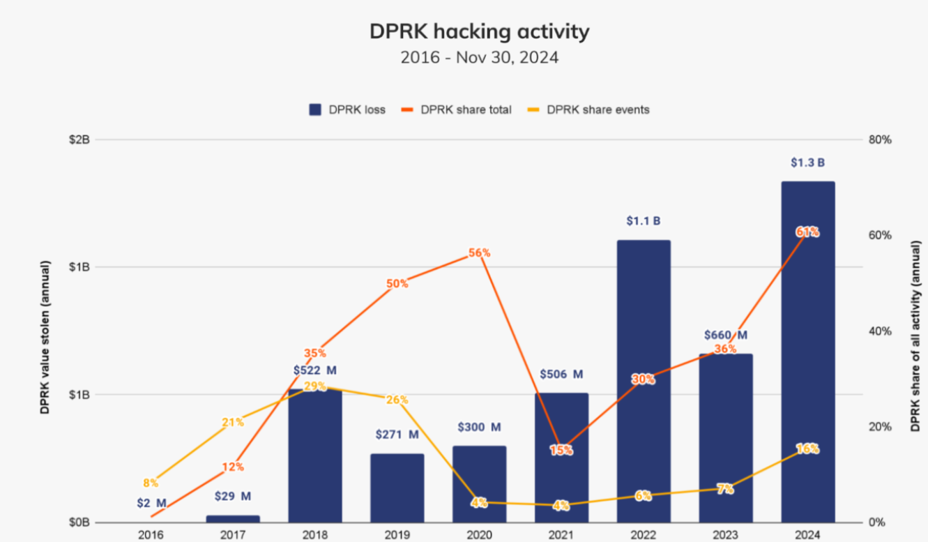 Während des gesamten Jahres 2024 haben nordkoreanische Hacker digitale Vermögenswerte im Wert von über 1,34 Milliarden US -Dollar bei 47 Vorfällen gestohlen, was einem Anstieg von 102% gegenüber dem gestohlenen 660 Millionen US -Dollar im Jahr 2023 gestohlen wurde. nach Daten zu ketten.
