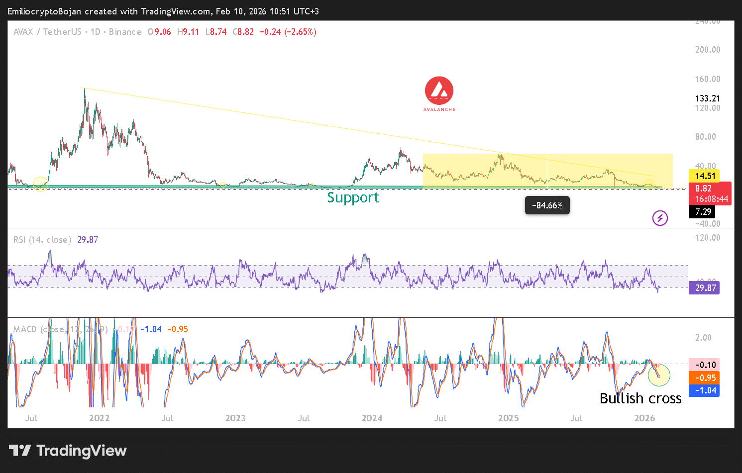 Die Preisentwicklung von AVAX im täglichen Zeitrahmen erzählte eine brutale, unversöhnliche Geschichte. Zum Zeitpunkt der Drucklegung war der Altcoin von seinem Höchststand im Oktober um über 84 % zurückgegangen, bevor er sich in der Nähe der Unterstützungszone von 8,85 $ bis 11,86 $ stabilisierte.
