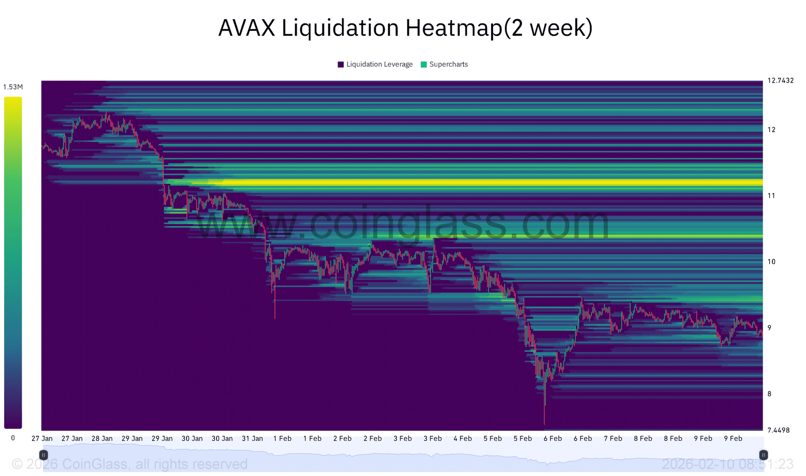 Die Abwärtsliquidität war vor dem 10. Februar 2026 weitgehend beseitigt. Infolgedessen zeigten die zweiwöchigen Liquidationsdaten, dass sich die Aufwärtsliquidität zum Zeitpunkt der Drucklegung in einer Konzentration zwischen 10 und 12 US-Dollar bewegte.