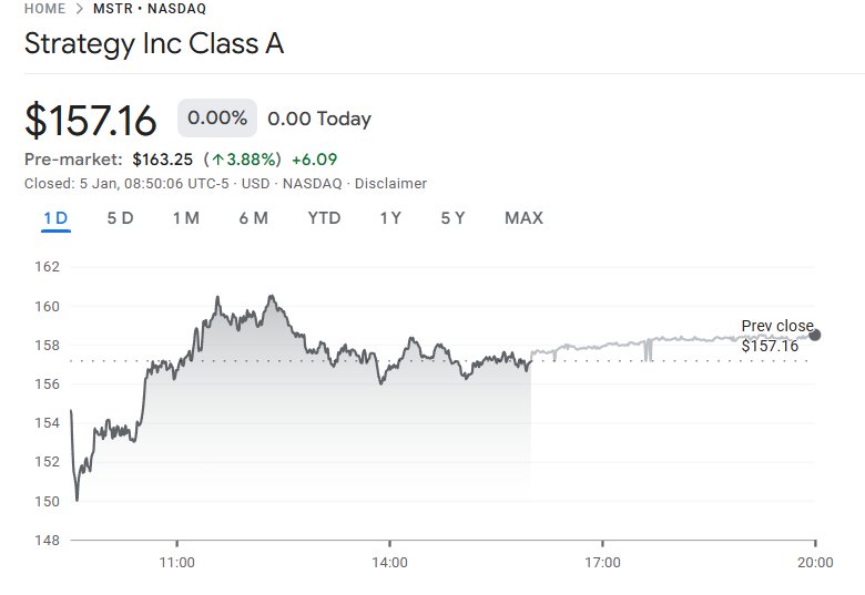 Der Aktienkurs von Strategy stieg am Montag im vorbörslichen Handel um 3,88 % auf über 157 US-Dollar, ist aber im vergangenen Jahr um über 58 % gefallen, so Google Finance Daten zeigt.