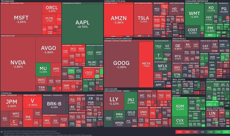 Die heutige Markt-Heatmap zeigt weit verbreitete Rückgänge im Technologiesektor. Microsoft (MSFT) fiel um 1,85 % und Oracle (ORCL) sank um 2,49 %, was die Schwierigkeiten des Sektors verdeutlicht. Bei Halbleitern fiel Nvidia (NVDA) um 1,80 %, während Advanced Micro Devices (AMD) einen Rückgang von 2,22 % verzeichnete, was auf Bedenken der Anleger und mögliche Gewinnmitnahmen hindeutet.