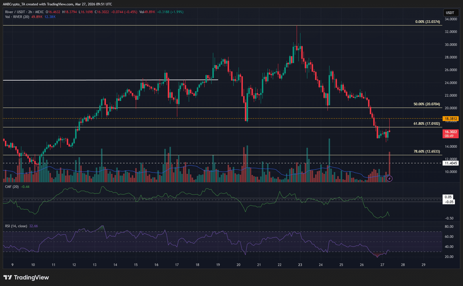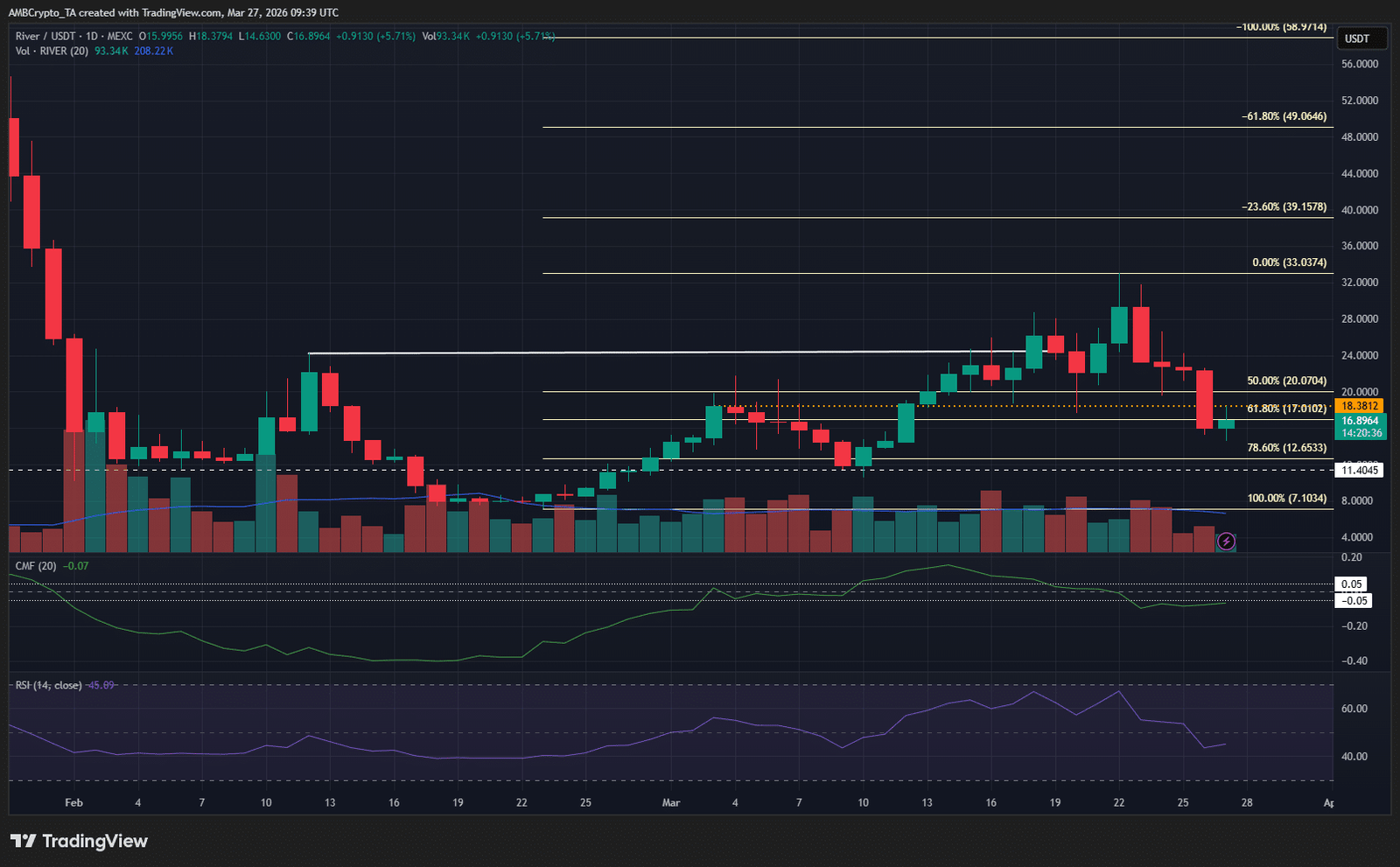 Dieses RIVER-Retracement ist eingetreten. Seit dem vergangenen Sonntag ist RIVER von 33 $ auf 17,8 $ zum Zeitpunkt des Schreibens gefallen, was einem Rückgang von 46 % entspricht. Der Bitcoin-Ausverkauf seit Mittwoch, dem 25. März, hat sich auch auf die Altcoin-Stimmung ausgewirkt.