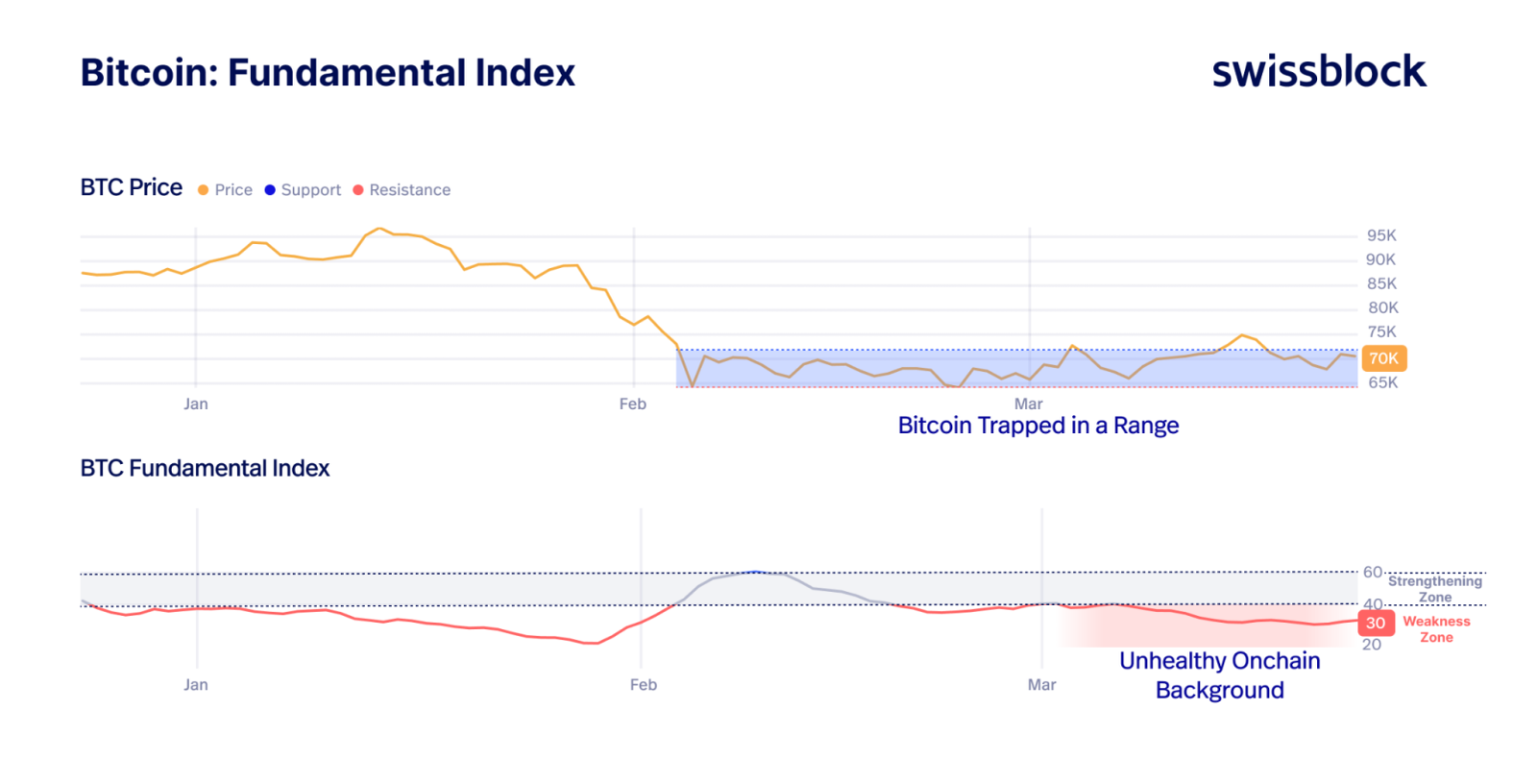 Dies steht im Einklang mit schwachen On-Chain-Fundamentaldaten wie Liquidität und Netzwerkwachstum, die im Fundamentalindex von Bitcoin Vector erfasst werden.