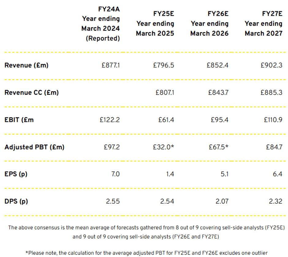 Im April 2024 gab das Unternehmen Leitlinien für die erwartete Leistung für das am 31. März endende Geschäftsjahr heraus. Es warnte: “Wir konnten ein Worst-Case-Szenario von PBT (Gewinn vor Steuern) von rund ein Drittel des GJ24-Niveaus sehen”.
