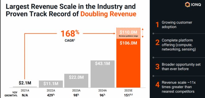 Im Jahr 2025 soll der Umsatz von IonQ um mehr als 150 % auf rund 108 Mio. US-Dollar steigen. Dann weitere 78 % auf fast 200 Millionen US-Dollar und möglicherweise über 1 Milliarde US-Dollar bis 2030.