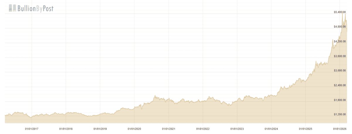Von 1.148 US-Dollar pro Unze Anfang 2017 ist der Goldpreis in den letzten Jahren sprunghaft angestiegen. Während ich dies schreibe, liegt er über 4.650 US-Dollar, selbst nachdem er kürzlich um mehr als 10 % gefallen ist. Unterdessen hat sich der Silberpreis im vergangenen Jahr mehr als verdoppelt.