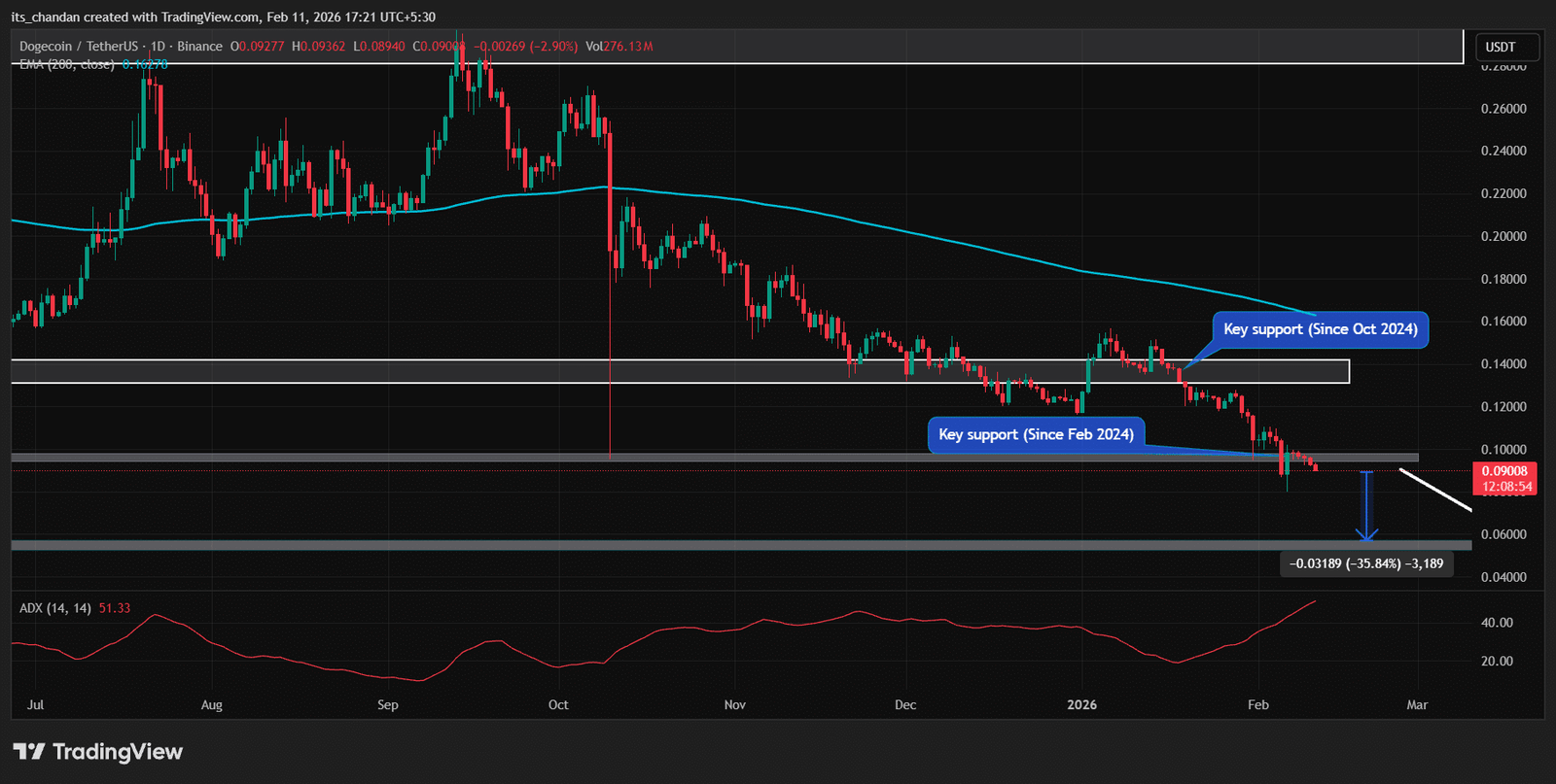 - DOGE hat seine wichtige Unterstützung bei 0,095 $ verloren, einem Niveau, das es seit Februar 2024 gehalten hatte, und die aktuelle Preisentwicklung deutet nun auf einen weiteren möglichen Rückgang um 35 % hin.