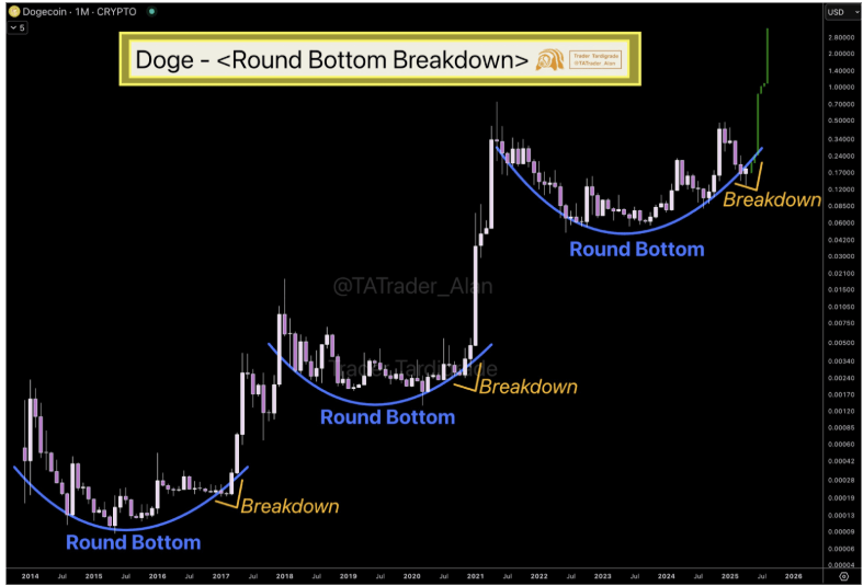 0,25 USD sind jedoch kurzfristig nur das Ziel. In eine separate AnalyseTrader Tarderrade wies auf Langzeitdiagramm von Dogecoin hin und hob eine runde Bodenformation hervor. Die dazugehörige Tabelle zeigt, dass in früheren Zyklen der Preis von Dogecoin einen abgerundeten Boden bildete, bevor sie explosive Aufwärtstrends betraten. Dieses wiederholte Muster, das jetzt wieder auf dem monatlichen Zeitrahmen sichtbar ist, signalisiert, dass Dogecoin möglicherweise kurz vor einem weiteren signifikanten Ausbruch steht. Der langfristiges Kursziel In diesem Fall beträgt 2,8 USD.