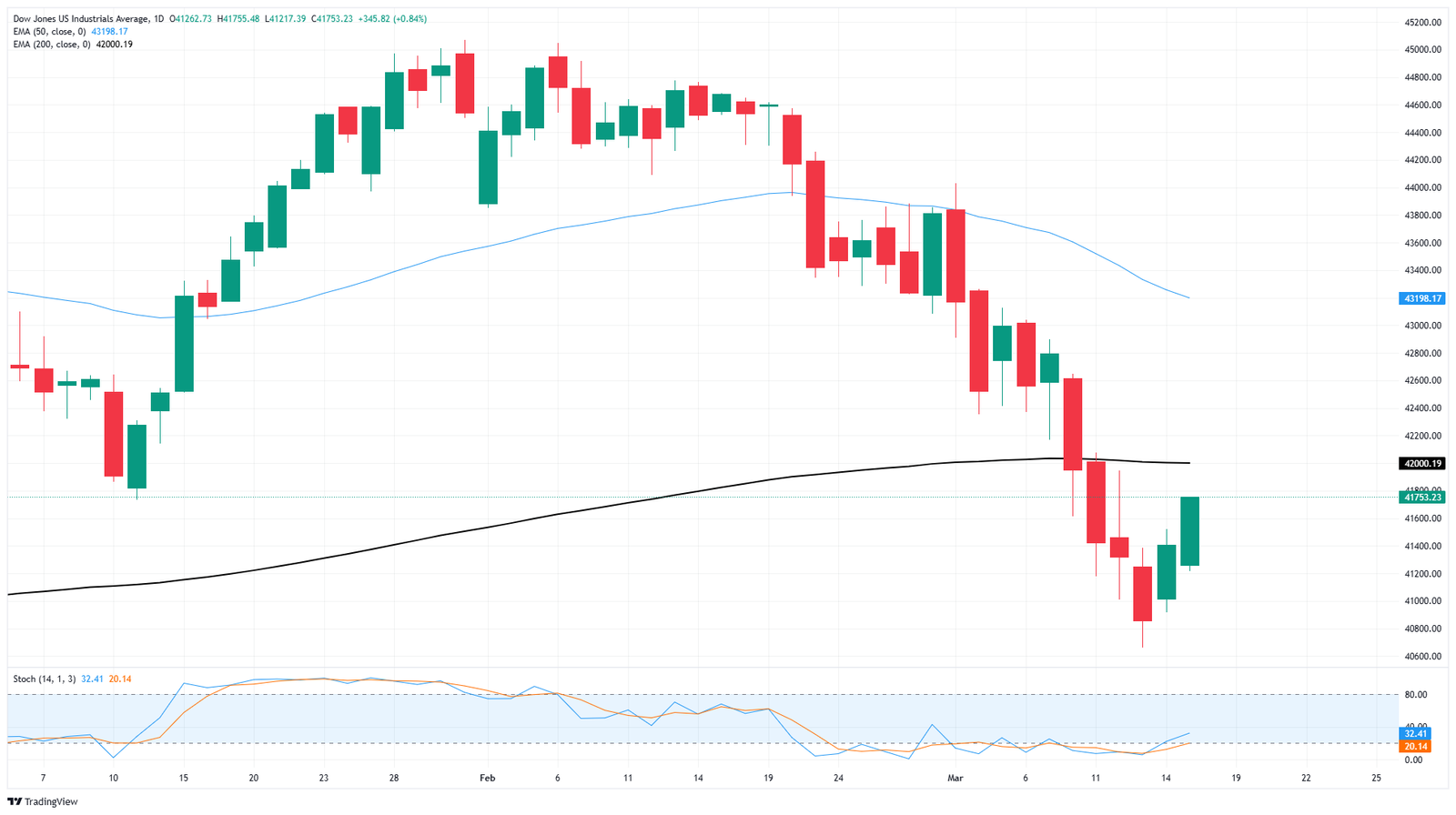 Der Bietendruck drückt den Dow Jones zurück in den 200-Tage-exponentiellen gleitenden Durchschnitt (EMA) am 42.000-Griff. Die DJIA fand eine technische Etage auf 41.000 Schlüsselpreisniveau, aber die Käufer bleiben am unteren Ende eines besonders steilen Lochs, da der Dow im November im November von 45.000 3.300 Punkten unter den Rekordhochs handelt.