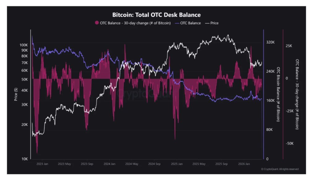 Außerbörslich ist die 30-Tage-Veränderung der OTC-Desk-Salden negativ geworden, was ein Zeichen dafür ist, dass Institutionen oder große Käufer das Angebot außerhalb der sichtbaren Marktinfrastruktur absorbieren.