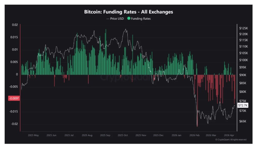 Fördersätze quer Alle wichtigen Börsen lagen am 10. April bei -0,0118 % und am 11. April bei -0,0101 %, zwei aufeinanderfolgende Sitzungen mit stark negativen Werten. Seit Ende März ist die negative Finanzierung das vorherrschende Regime, und den ganzen April über blieb die Kennzahl im negativen Bereich, ohne einen einzigen positiven Umschwung.