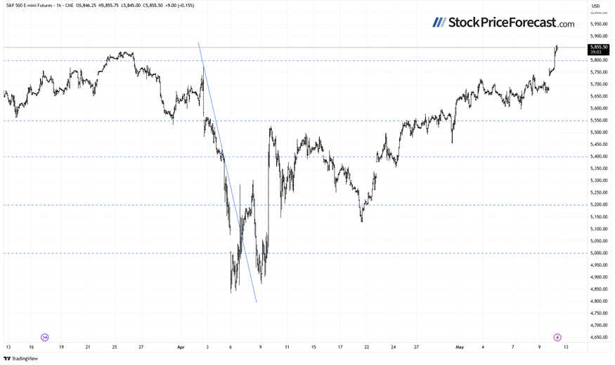 Heute Morgen hat sich der S & P 500-Futures-Vertrag entschlossen über der 5.700-5.720 Widerstandszone, die letzte Woche die Preise enthielt, gebrochen. Dieser technische Ausbruch, der durch das Handelsabkommen des Wochenendes angetrieben wird, eröffnet die Tür zu potenziellen Zügen zu 5.900-6.000.