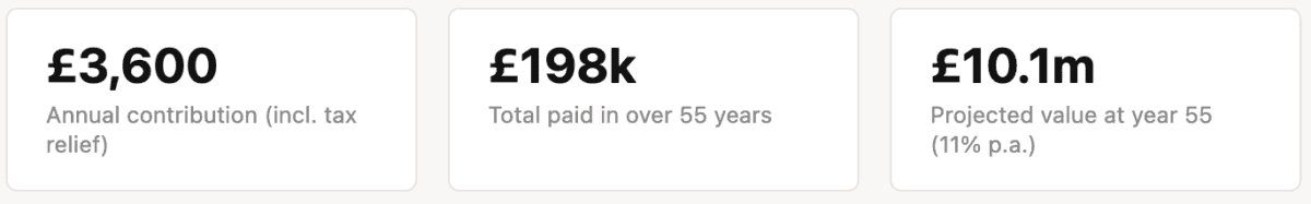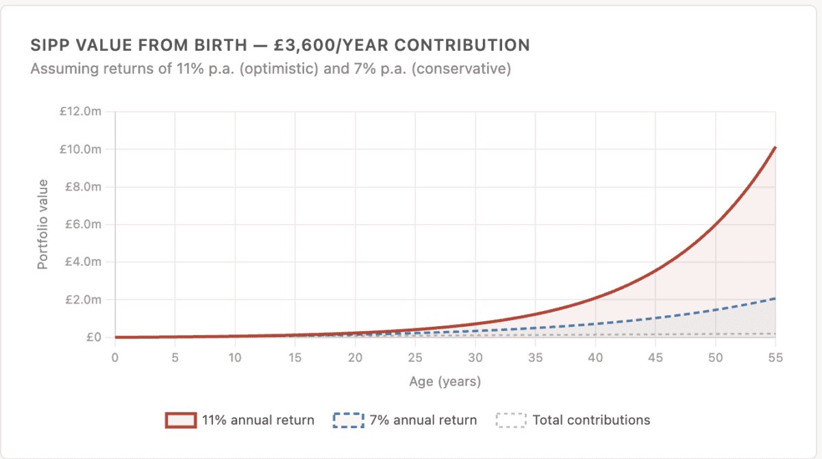 Die Mechanik ist einfach, aber leistungsstark. Eltern und Großeltern können bis zu 2.880 £ pro Jahr in das SIPP eines Kindes einzahlen – und obwohl das Kind keine Steuern zahlt, fügt die Regierung eine Ermäßigung von 20 % hinzu, sodass sich der jährliche Gesamtbeitrag auf 3.600 £ beläuft. Das ist es. Das ist die ganze Strategie.