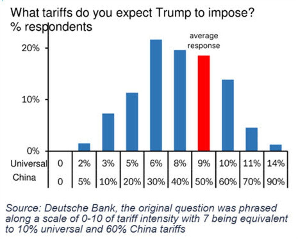 Jetzt ist die Deutsche Bank mit einer Übersicht über ihre eigene Liste von 400 Investoren unterwegs und schätzt 50% Zölle auf China und einen Tarif von etwas unter 10% für alle anderen.