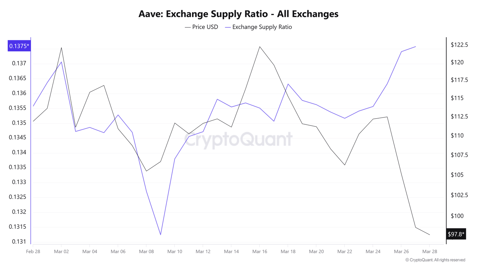Darüber hinaus spiegelten die Börsenaktivitäten diese Verkäuferdominanz wider. Den Daten von CryptoQuant zufolge flossen 79.000 AAVE-Tokens in die Börsen, verglichen mit 74.000, die abflossen.