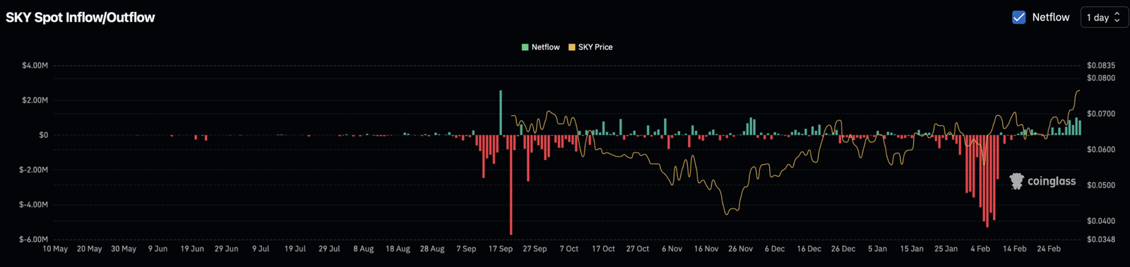 Himmel [SKY]der native Token des dezentralen On-Chain-Protokolls, verzeichnete am vergangenen Tag einen zweistelligen Zuwachs, da sich die Anlegerstimmung weiter verbessert.