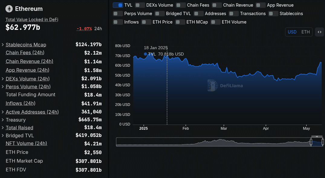Ein Anstieg der Waltransaktionen Anfang Mai und steigendes TVL deuten jedoch auf ein erneuter Vertrauen hin. TVL erholte sich im April von unter 55 Milliarden US-Dollar auf fast 63 Milliarden US-Dollar im Mai, was die wachsende Aktivität auf Ketten widerspiegelte.
