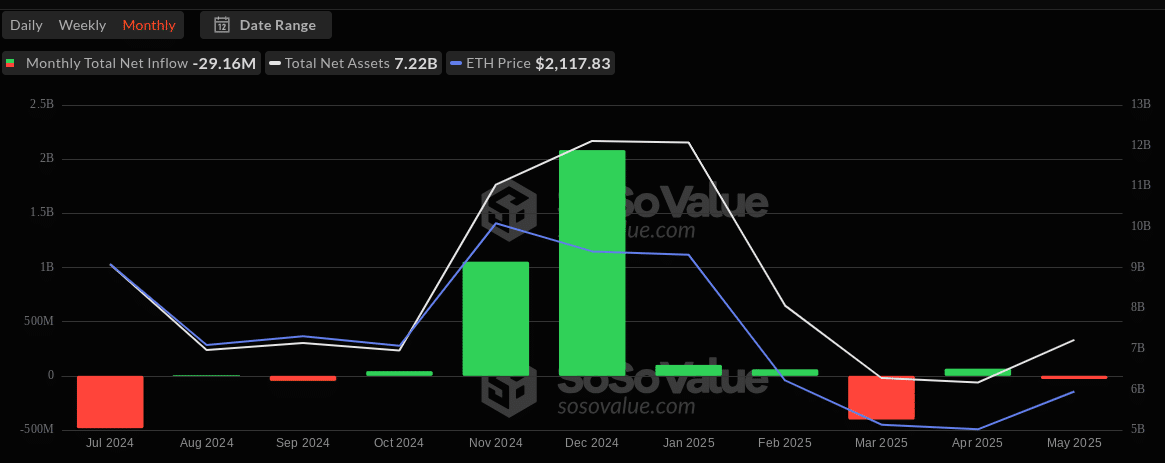 ETF-Daten zeigen eine scharfe Zuflussspitze im November-Dezember 2024, gefolgt von einer Abklingzeit.