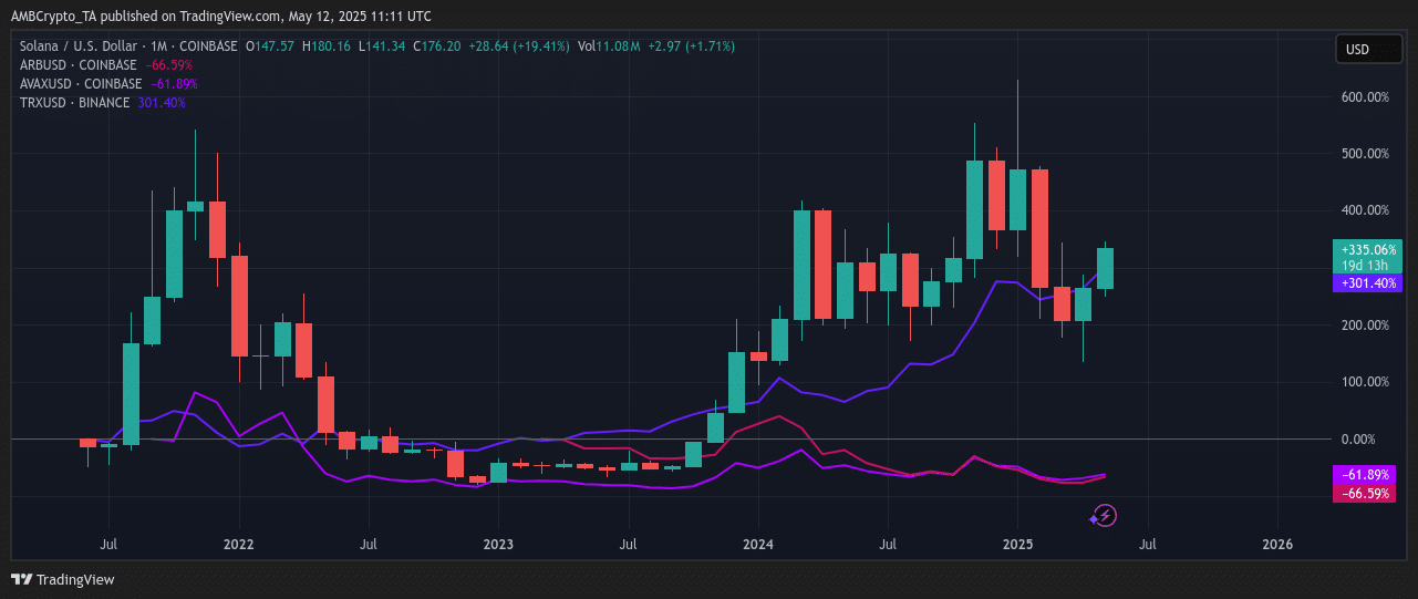 Inzwischen mögen konkurrierende Ketten Solana[SOL] Und Tron [TRX] sehen beeindruckende Wiederherstellungen und zeigen eine breitere Schicht -1 -Impuls an.