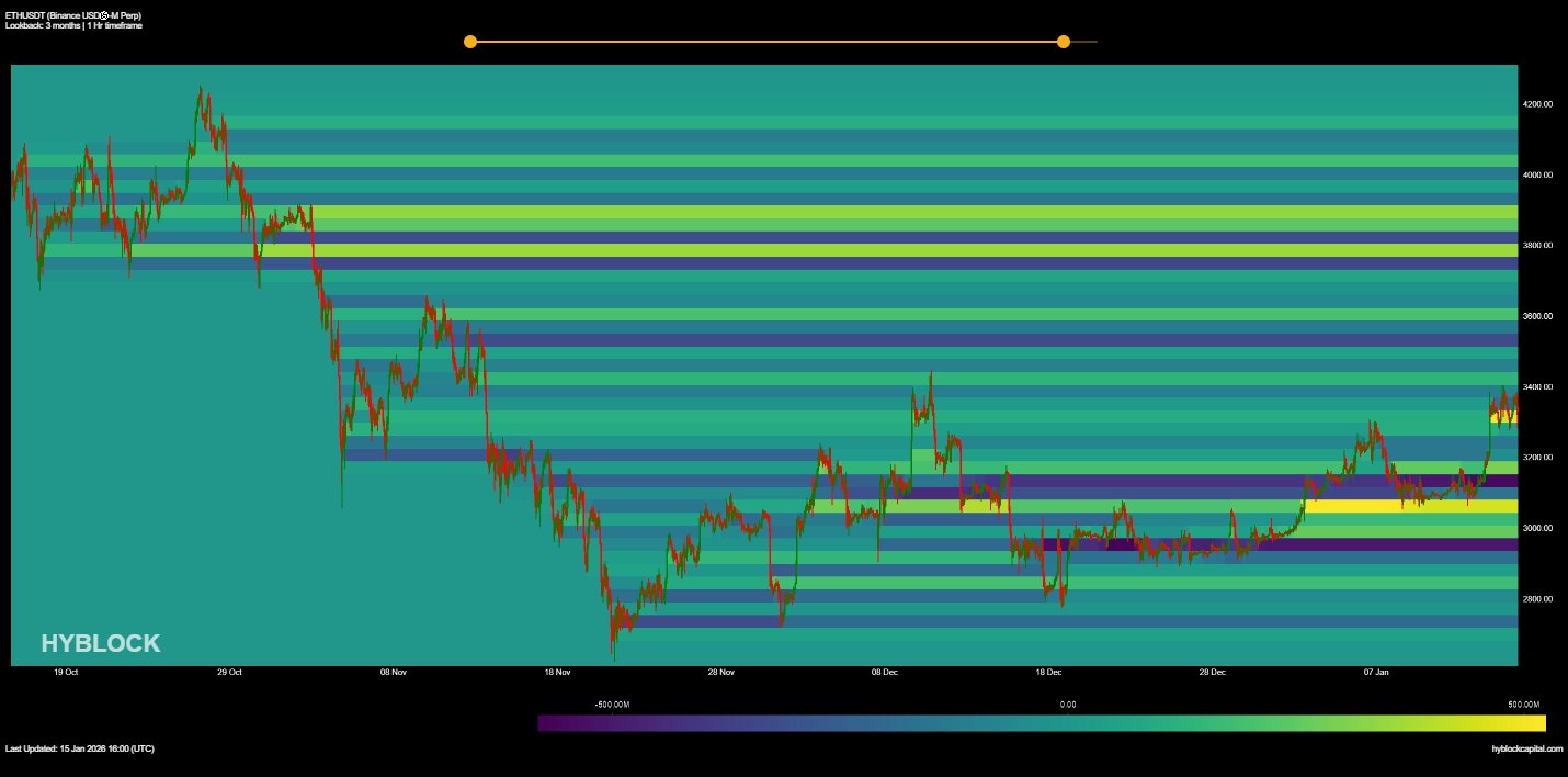 Ich befürworte diese Ansicht, Hyblock-Daten zeigt eine Netto-Long-Konzentration über 500 Millionen US-Dollar zwischen 3.040 und 3.100 US-Dollar. Eine solche dichte Positionierung erhöht die Wahrscheinlichkeit eines kurzfristigen Vorstoßes in diesen Bereich und bereitet möglicherweise die Voraussetzungen für eine stärkere Fortsetzungsbewegung danach.