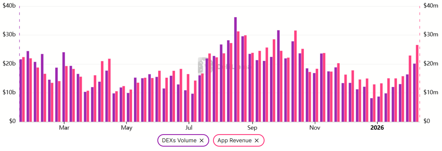 Das wöchentliche dezentrale Börsenvolumen verdoppelte sich auf 20 Milliarden US-Dollar, wodurch sich die Umsatzlücke zu Solana verringerte.