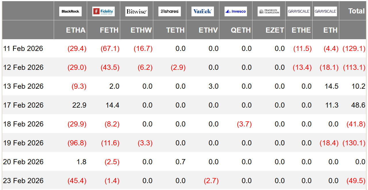 Die in den USA notierten Ether-ETFs verzeichneten seit dem 11. Februar Nettoabflüsse in Höhe von 405 Millionen US-Dollar, was zu einem Rückgang des gesamten verwalteten Vermögens auf 12,4 Milliarden US-Dollar führte. Diese Verschiebung erfolgte genau zu dem Zeitpunkt, als der Goldpreis über 5.150 $ stieg. Laut gold.org haben Gold-ETFs in der Woche bis zum 20. Februar tatsächlich 822 Millionen US-Dollar eingenommen.