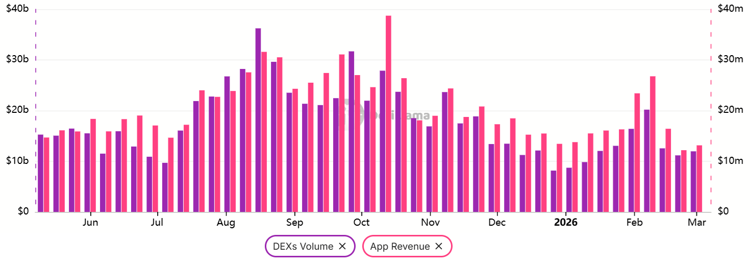 Das wöchentliche DEX-Volumen im Ethereum-Netzwerk erreichte kürzlich 12,6 Milliarden US-Dollar und ist damit von 20,2 Milliarden US-Dollar im Vormonat gesunken. Die Einnahmen aus dezentralen Anwendungen (DApp) sanken innerhalb von sieben Tagen auf 14,1 Millionen US-Dollar, was einem Rückgang von 47 % gegenüber dem Vormonat entspricht. Bei konkurrierenden Blockchains war ein ähnlicher Trend zu verzeichnen, da das DEX-Volumen auf Solana im selben 30-Tage-Fenster ebenfalls um 50 % zurückging.