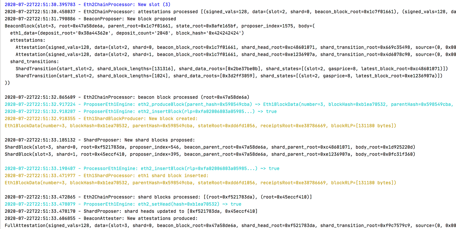 Seitdem die oben genannten Beiträge geschrieben wurden, waren Mikhail und Guillaume damit beschäftigt, diese Konzepte in die Realität umzuwandeln. Der Katalysator von Guillaume – eine Version von Geth, die seinen Konsens zu RPC -Aufrufen (dh ein ETH2 -Kunde) beeinflusst – ist gebaut und bereit zu gehen. Die Implementierung von Mikhail 1 führt mit ausgewählten Scherben, die die Blockproduktion und die Gültigkeitsanrufe auf ein lokales, stumpfes ETH1-Engine aufschieben, vollständig Sharded ETH2-Simulationen aus.