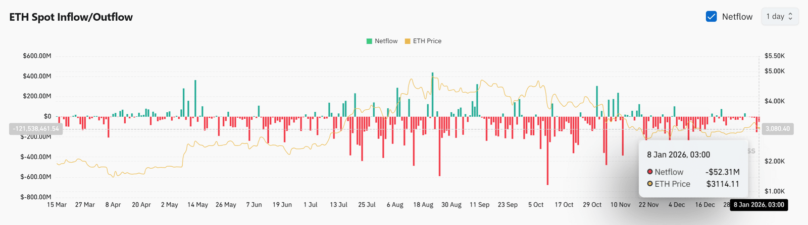 ETH postete weiter anhaltende Nettoabflüsse aus Börsen. Jüngste tägliche Zahlen zeigten Abhebungen von mehr als 52,3 Millionen US-Dollar, was einen mehrwöchigen Trend fortsetzt.