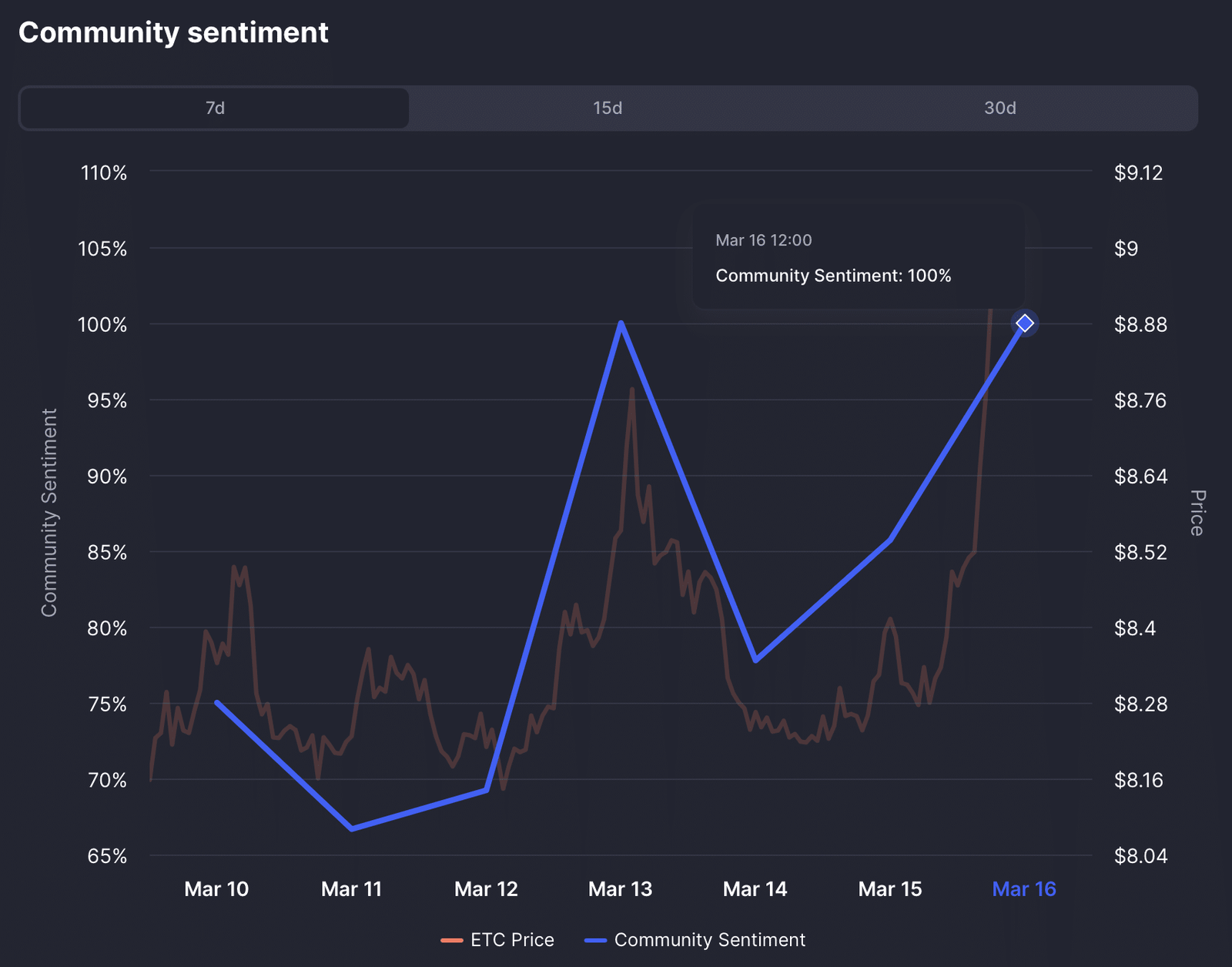 Der Indikator, der die Stimmen der Community zusammenfasst, um zu verfolgen, ob Händler bullisch oder bärisch sind, zeigte, dass 100 % der rund 4,3 Millionen Teilnehmer weiteres Aufwärtspotenzial für ETC erwarteten.