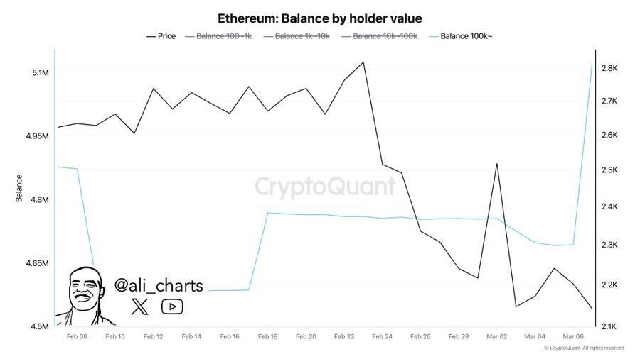 Es hat eine starke Zunahme der Guthaben von Brieftaschen mit mehr als 100.000 ETH aufgetreten, was darauf hinweist, dass der strategische Kauf durch tief in die Focketierten anlegt.