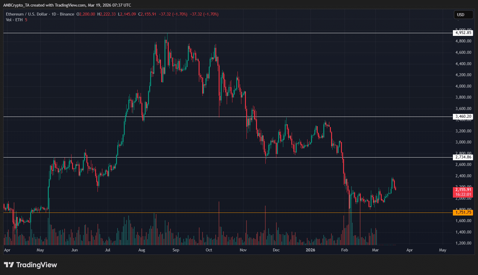 Ethereums [ETH] Die jüngsten Preisbewegungen spiegeln eine Übergangsphase wider, in der der vorherige Verkaufsdruck an Schwung verliert, während Käufer die Kontrolle testen. Bei rund 2.155 US-Dollar reagiert der Preis, nachdem er sich von der Unterstützungszone von 1.750 US-Dollar erholt hat, wo die Nachfrage frühere Ausverkäufe absorbierte.