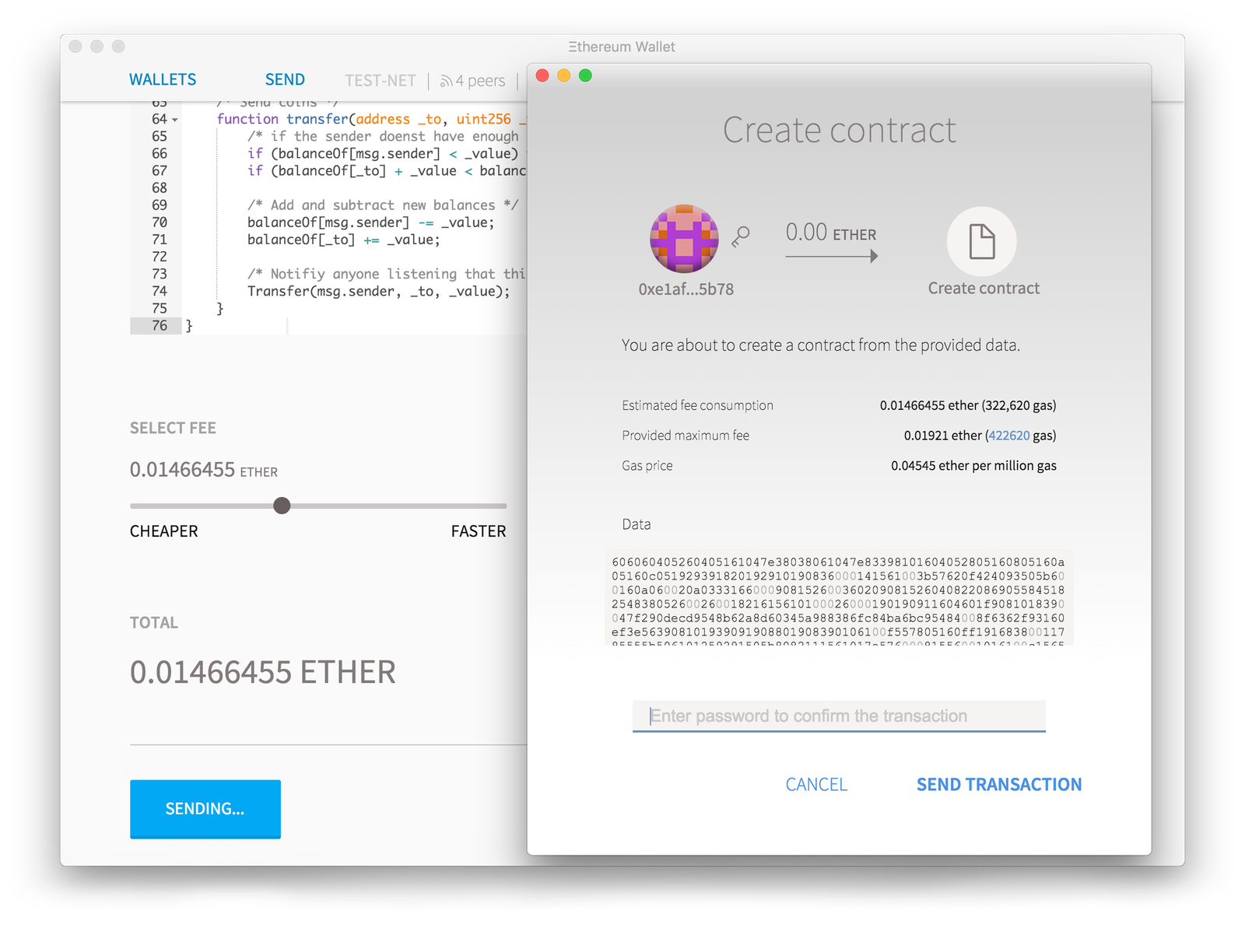Das erste, was Sie darauf tun müssen, ist, ein Ethereum -Konto zu erstellen. Alles, was Sie dafür brauchen, ist ein starkes Passwort und Sie erhalten es. Um etwas zu tun, müssen Sie etwas Äther einsetzen: Aber mach dir keine Sorgen, du brauchst nicht viel. Die meisten Verträge hier kosten weniger als ein Zehntel US -amerikanischer Penny. Wenn Sie es nur testen, empfehlen wir Ihnen, zum TestNet umzusteigen: Gehen Sie in das Menü Entwickeln> Netzwerk> TestNet (Morden) und dann weiter Entwickeln> Bergbau beginnen. Nach ein paar Minuten haben Sie wahrscheinlich genug Äther, um alles zu testen, damit Sie es ausschalten und Ihre Computerressourcen speichern können.