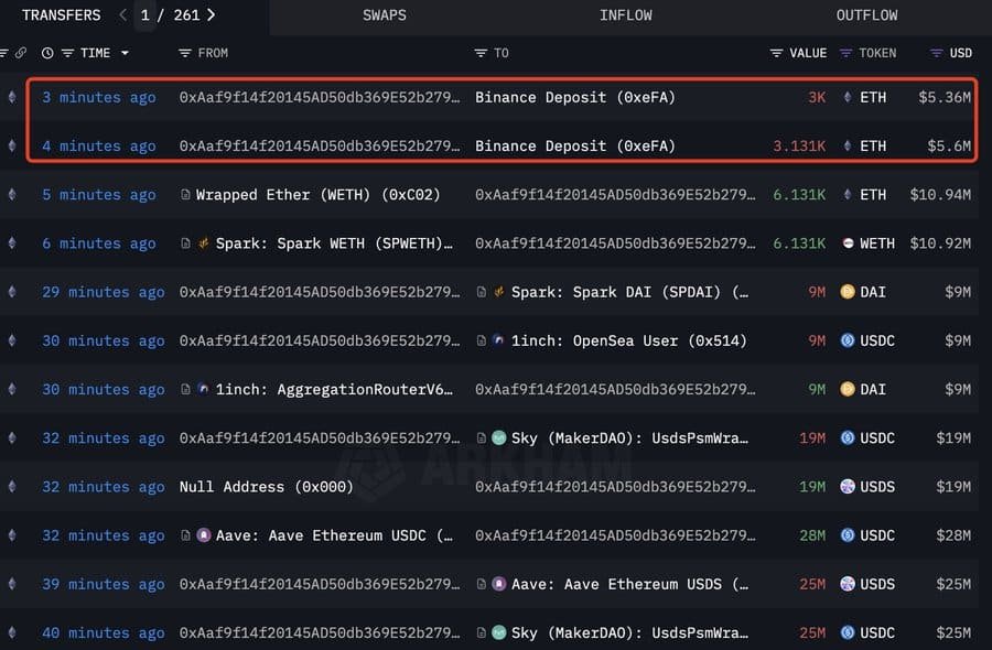In dieser Zeit berichtete LookonChain, dass ein Wal mit 6.131 ETH im Wert von 10,94 Millionen US -Dollar sein Vermögen in Binance, einen zentralisierten Kryptowährungsaustausch, verlegt hatte.