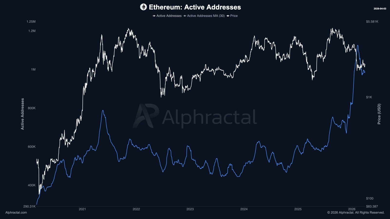 Die Krypto-Intelligence-Plattform Alphractal stellte fest, dass dieses Muster eines ist, das wir schon einmal gesehen haben. Im Jahr 2025 stieg der gleitende 30-Tage-Durchschnitt der aktiven Adressen stark an, während Ethereum zwischen 2,7.000 und 3,3.000 US-Dollar seitwärts handelte.