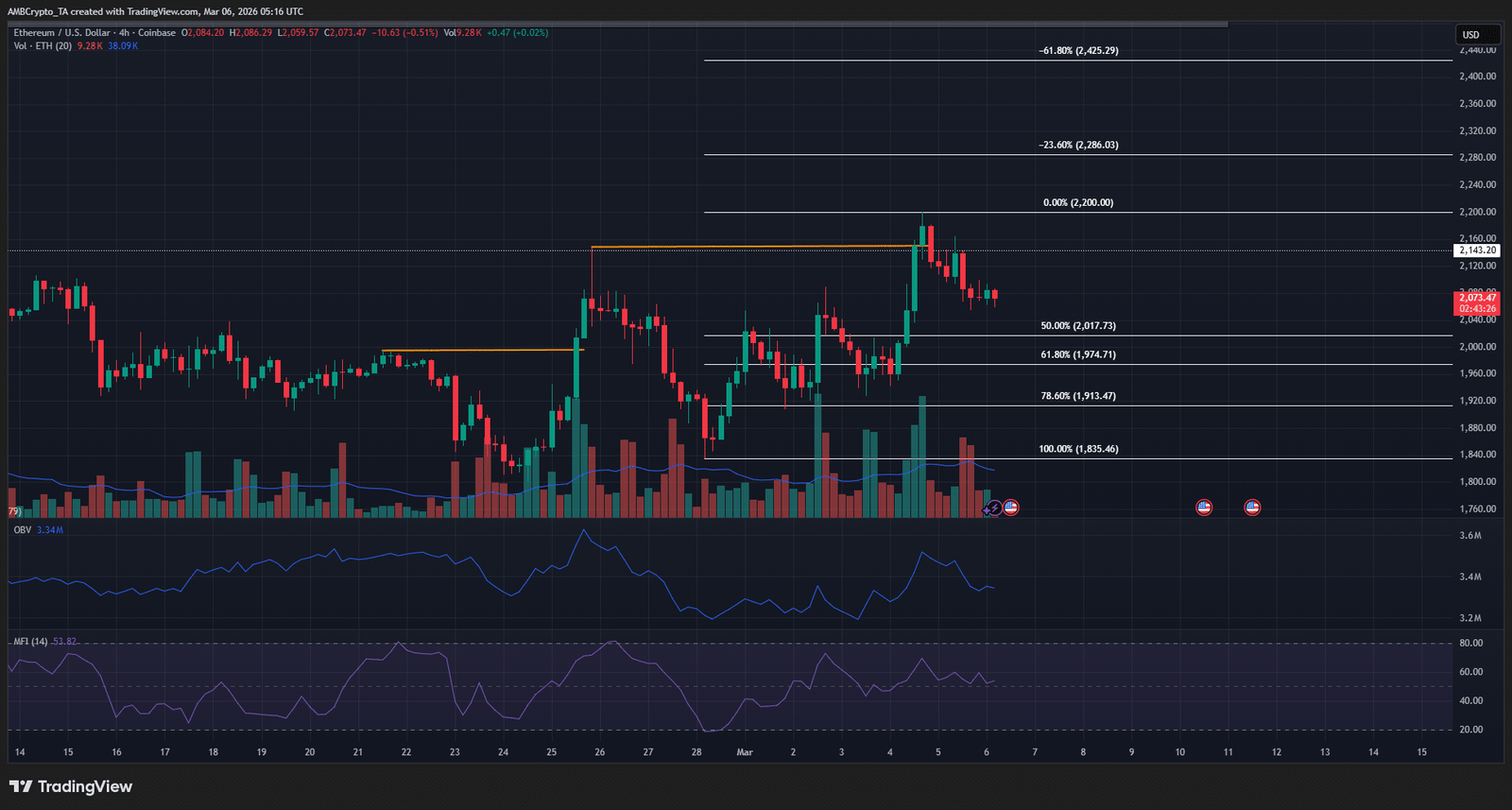 Eine Kundgebung muss nicht sofort beginnen. Das 4-Stunden-Chart zeigte eine zinsbullische Struktur, da frühere Swing-Hochs durchbrochen wurden (orange). Die Ablehnung bei 2.200 $ bedeutete, dass ein Retracement zu erwarten ist.
