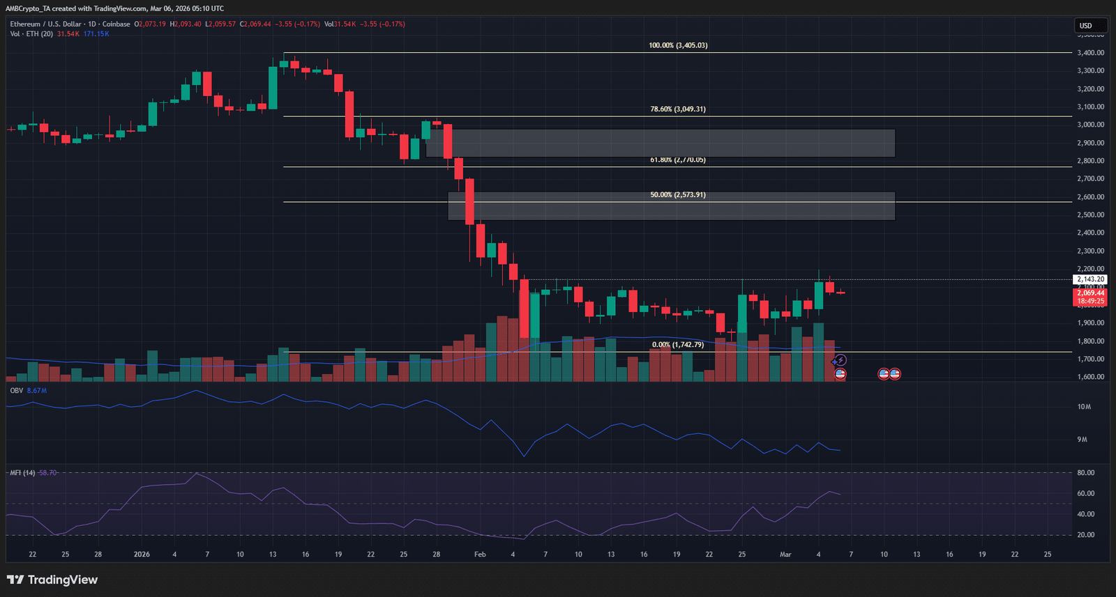 Trotzdem ist die Ethereum Die Preisprognose ist kurzfristig bullisch. Dies basiert auf Hinweisen aus der Preisbewegung. Der erste Hinweis ergibt sich aus der rückläufigen Bewegung von 3.405 $ auf 1.742 $ im Jahr 2026.
