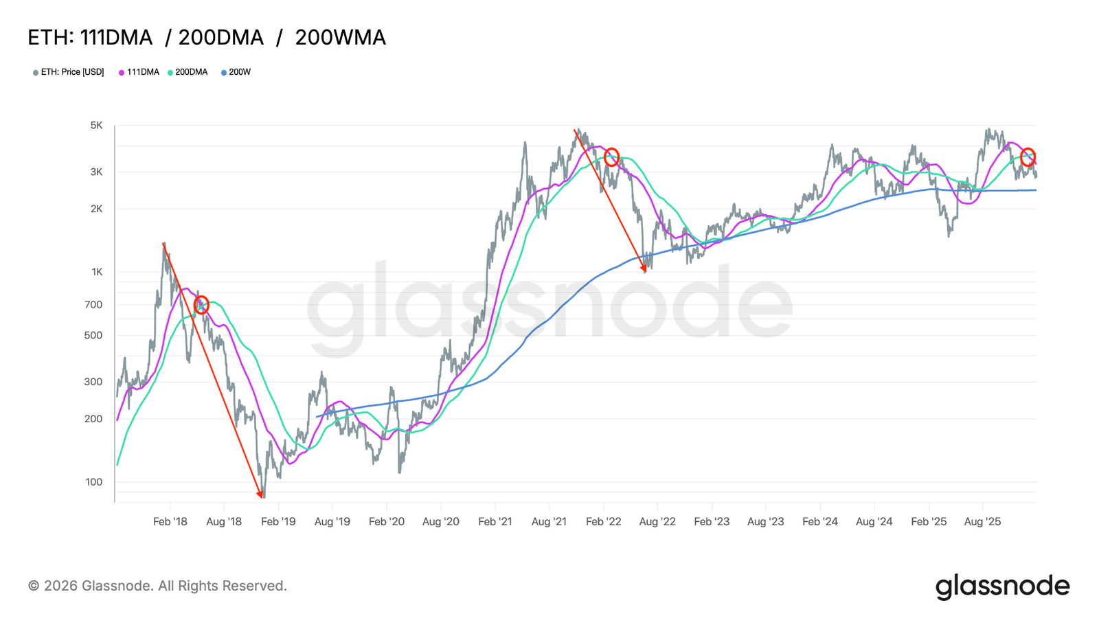 Unterdessen zeigen charttechnische Daten, dass der gleitende 111-Tage-Durchschnitt (MA) derzeit unter dem 200-Tage-MA liegt. Ähnliche Überschneidungen lösten während der Bärenmärkte 2018 und 2022 den Beginn tieferer ETH-Preisrückgänge aus, wie in der folgenden Grafik dargestellt.