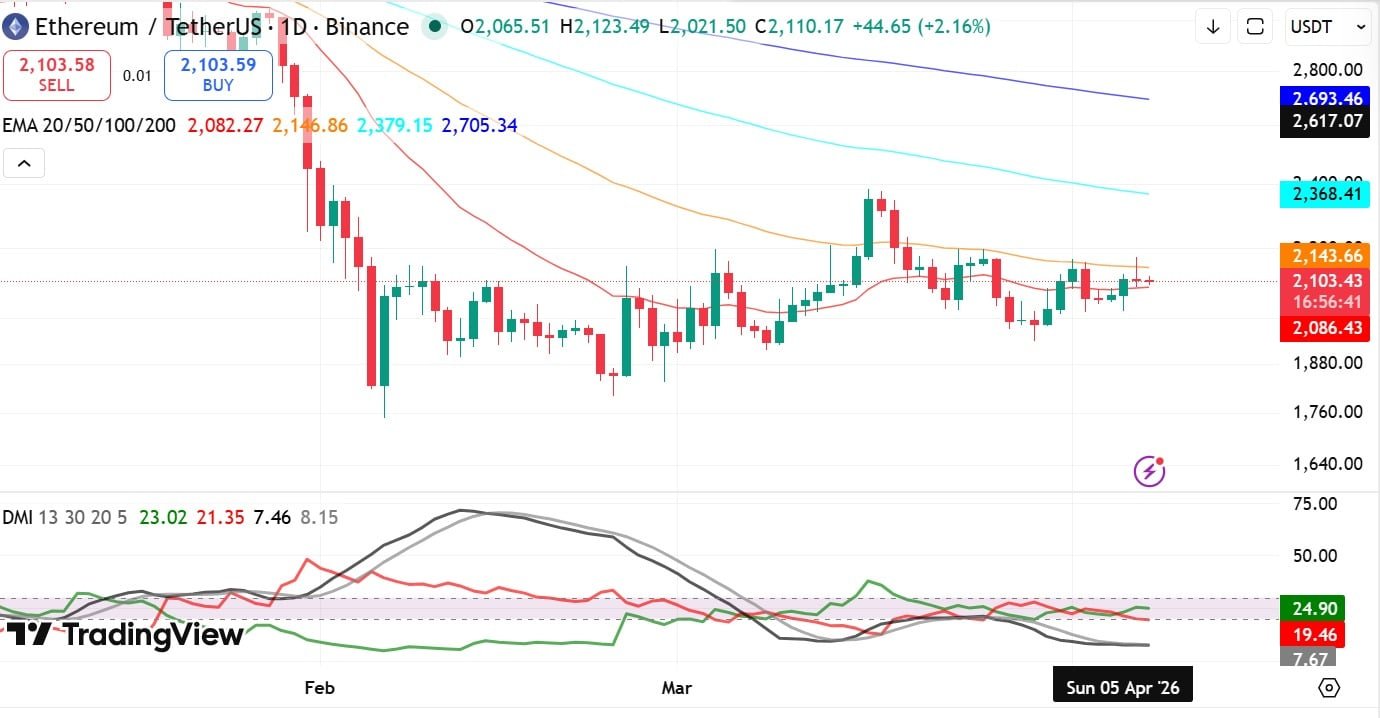 Zum Zeitpunkt dieses Schreibens wurde Ethereum bei 2.100 $ gehandelt, was einem Rückgang von 1,6 % auf dem Tages-Chart entspricht. Durch den Preisverfall fiel der Altcoin unter seinen 50-Tages-EMA, was darauf hindeutet, dass der kurz- bis mittelfristige Trend sich in einen Abwärtstrend verwandelte.