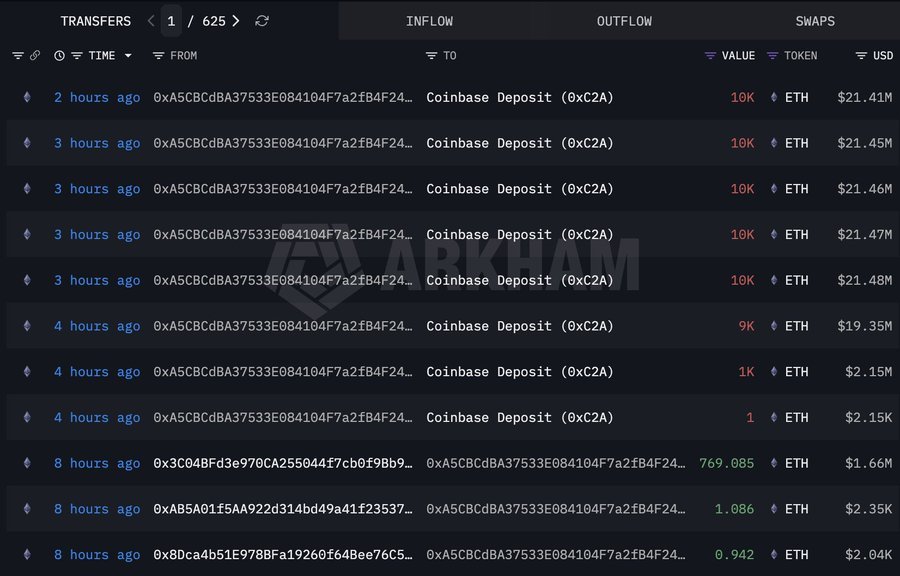 Als Ethereum weiterhin um die 2.000 US-Dollar gehandelt wurde, schienen einige Wale ungeduldig zu werden und begannen, ihre Vermögenswerte zu verschieben. Laut Arkham-Daten hat ein Wal 60.001 ETH im Wert von 128,8 Millionen US-Dollar bei Coinbase eingezahlt.