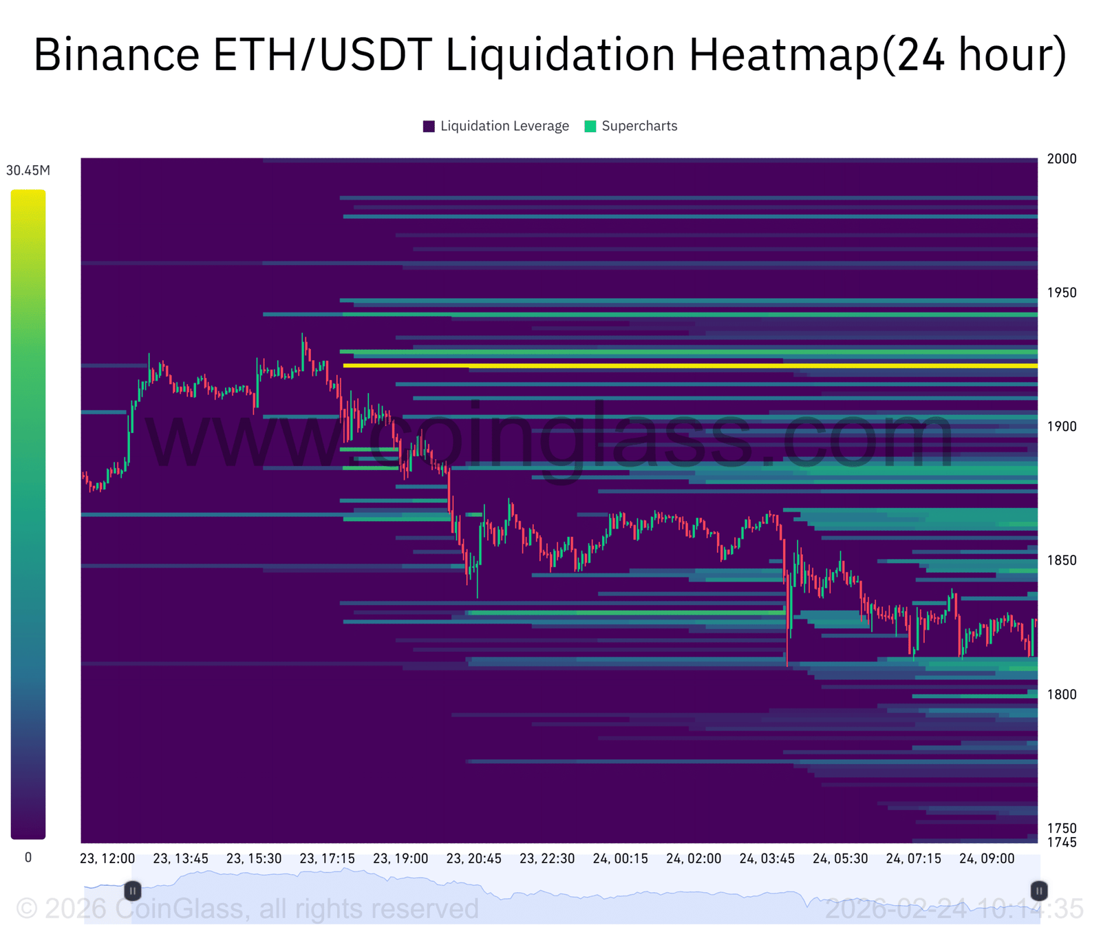 Der Binance ETH/USDT-Liquidations-Heatmap zeigt, dass sich ein dichter Leverage-Cluster in der Nähe von 1.923 US-Dollar bildet, wobei der Liquidations-Leverage in diesem Bereich 30,45 Millionen US-Dollar erreicht.
