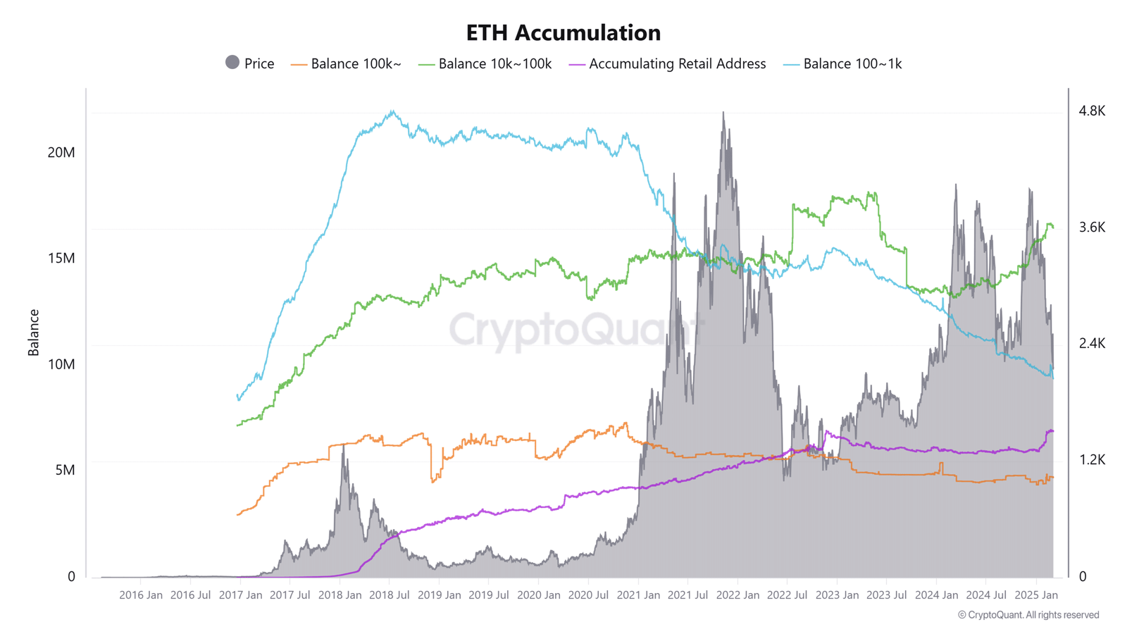 Die 10K-100K-ETH-Kohorte hat seit März 2024 ihre Beteiligungen erhöht, wobei der Trend vor kurzem beschleunigt wurde. In den Einzelhandelsadressen stieg Anfang Februar starke Bestände, aber dieser Trend hat sich seitdem abgeflacht.