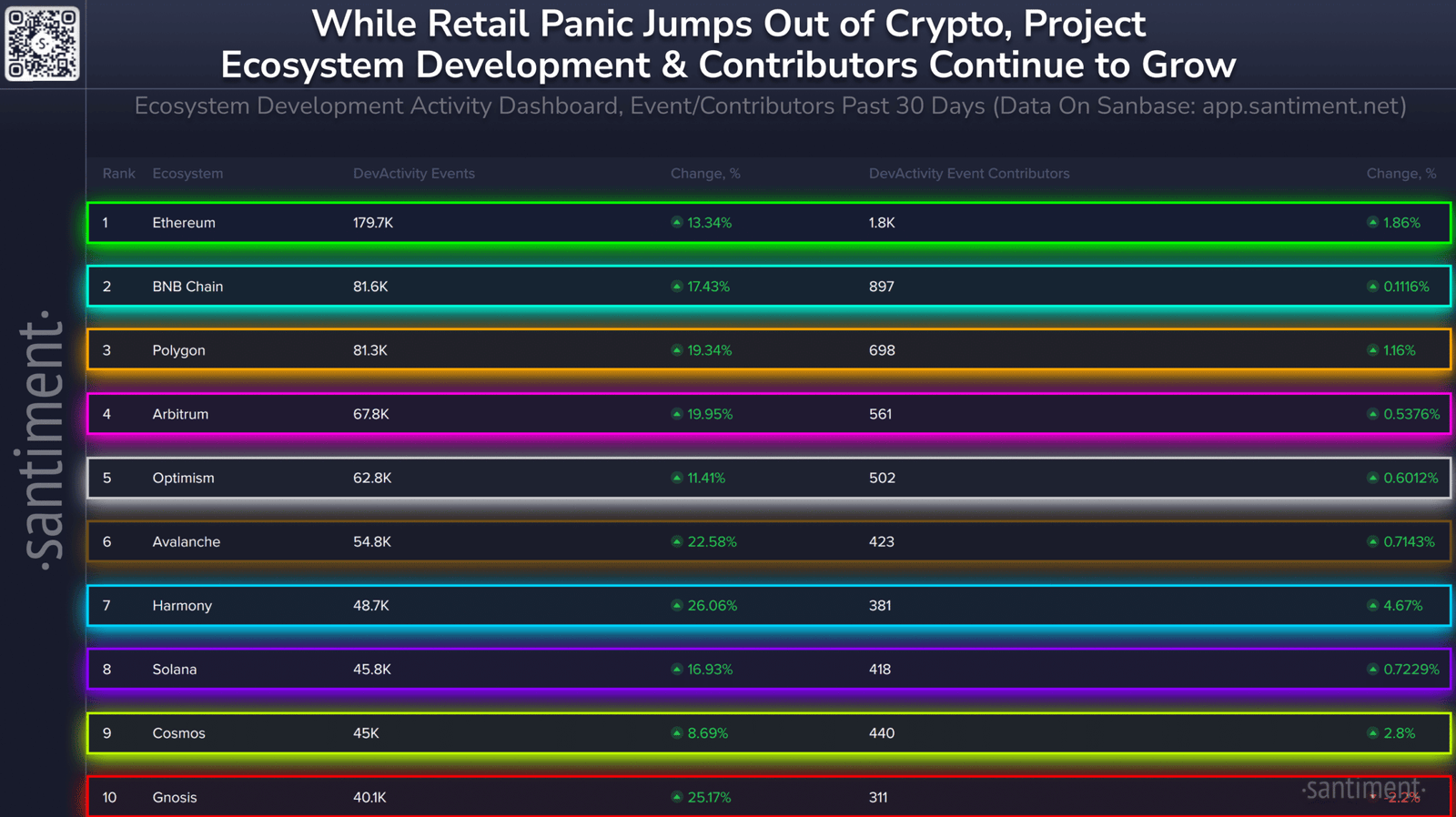 Analyst Brian beobachtet in einem Beitrag auf Santiment Insights Dass die Entwicklungsaktivität stieg, während die Marktkapitalisierung fiel. Ethereum verzeichnete eine Veränderung der Entwicklungsaktivitätsereignisse um +13% und eine Erhöhung der Mitwirkenden von +1,9% im vergangenen Monat.