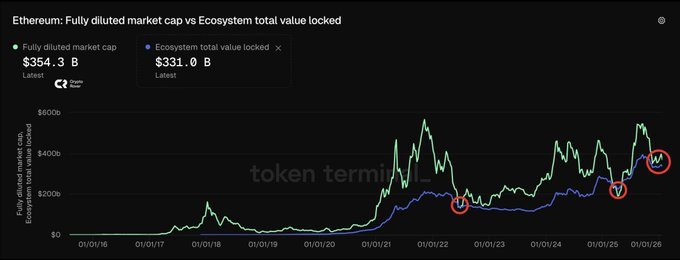 Historisch gesehen fielen Perioden, in denen ETH unter dem Wert des Ökosystems gehandelt wurde, mit langfristigen Akkumulationszonen zusammen. Frühere Fälle führten zu starken Erholungen, nachdem die Volatilität nachgelassen hatte.