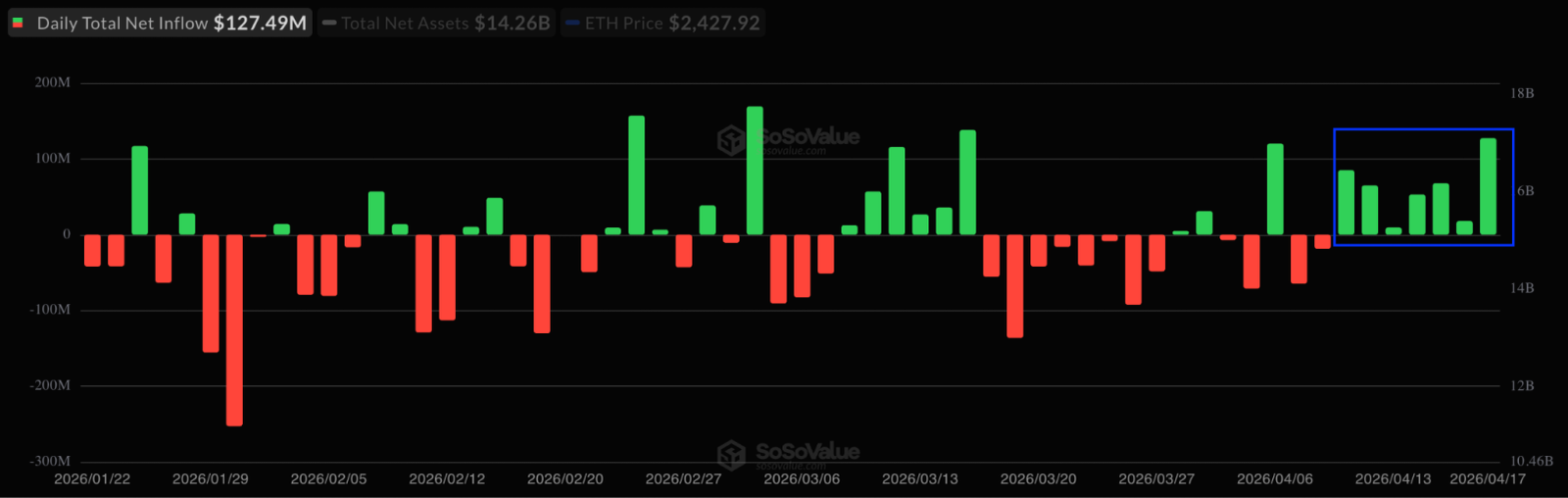 Diese Bewegungen fallen mit anhaltenden Zuflüssen zusammen Entdecken Sie Ethereum-ETFsdie an sieben aufeinanderfolgenden Tagen Nettozuflüsse in Höhe von insgesamt 426 Millionen US-Dollar verzeichneten.