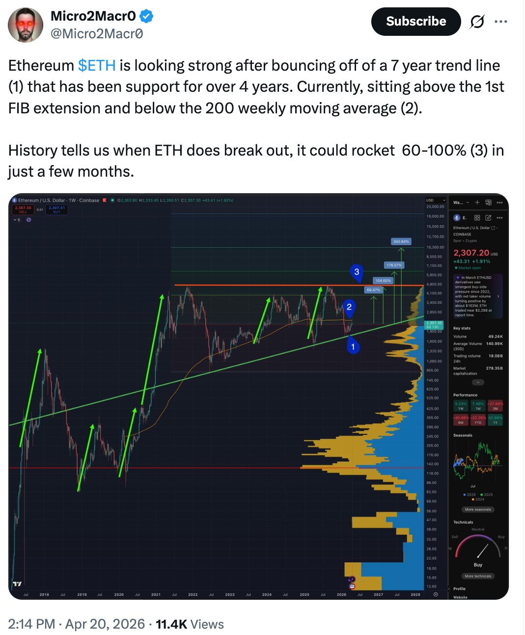 Der Analyst Micro2Macr0 sagte im Detail, dass ein Ausbruch aus einem mehrjährigen aufsteigenden Dreieck zu einer ETH-Preisrallye von 60 % bis 100 % führen könnte.