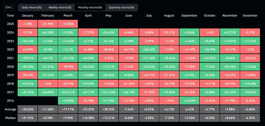 Zum ersten Mal in den letzten zehn Jahren hat Ethereum veröffentlicht Drei aufeinanderfolgende Monate der Verluste Ein Kalenderjahr ausführen. Von Januar bis März 2025,