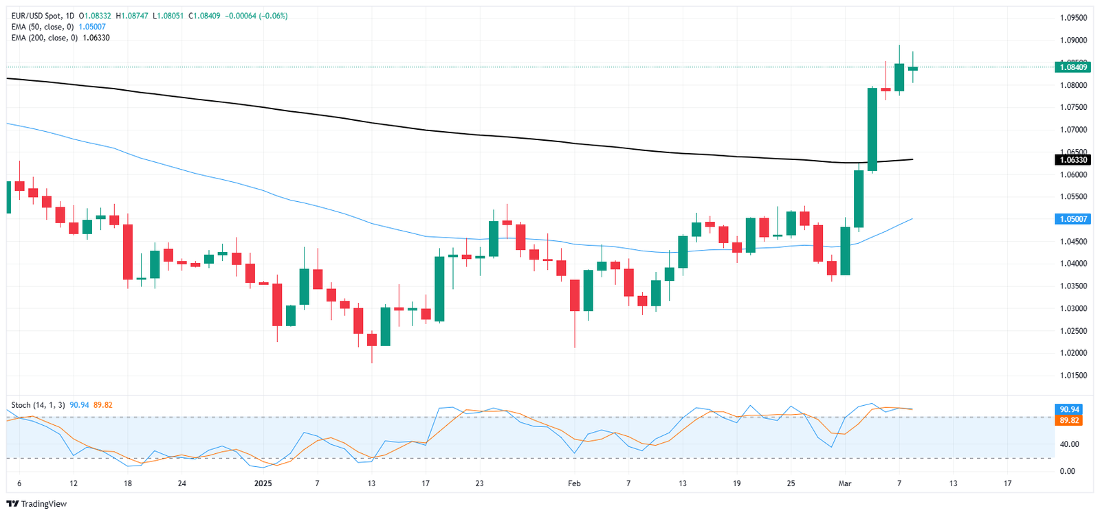 EUR/USD steckte am Montag im Mist fest, Mulching -Chartpapier in der Nähe der Region 1.0850, da der jüngste Bull -Lauf von Fiber bis zu Ende aussieht. EUR/USD hat letzte Woche den 200-Tage-exponentiellen gleitenden Durchschnitt (EMA) leicht durchbohrt und durch den gleitenden Key-Durchschnitt in der Nähe von 1,0630 stieg.
